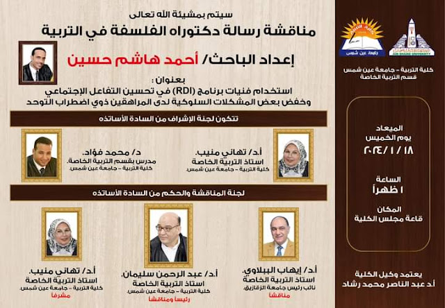 يتقدم الدكتور أحمد سالم ، والأستاذ سعيد بدوي وفريق العمل بجريدة الخبر المصري ، بالتهنئة القلبية الخالصة إلى الدكتور أحمد هاشم حسين بمناسبة حصوله على درجة الدكتوراه فى التربية (التربية الخاصة) ، كلية التربية ، جامعة عين شمس.